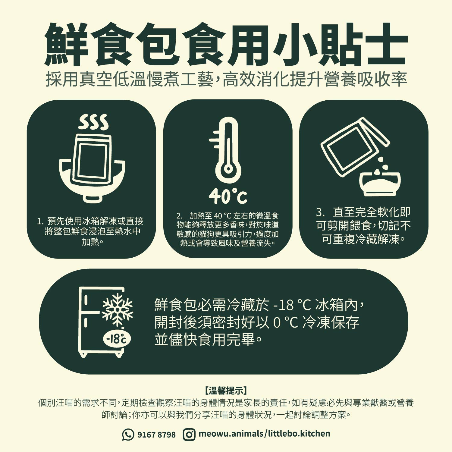 『採用多元食材配搭的全年齡食譜,營養均衡多款味道越吃越年輕!』 【阿寶記的慢煮鮮食餐包】 - 選用人類食用級別食材,天然成分絕無人造添加,真材實料粒粒分明,高效消化提升營養吸收率。 - 符合NRC國際專業標準的食譜,全面呵護各年齡階段寵物的營養需求。 - 採用真空低溫慢煮工藝,鎖住食材高達98%的營養,味道更濃郁,口感更鮮嫩。 - 經驗寵物營養師指導,客製化健康方案,解決所有你能遇到的飲食問題。 — CFS1「 雞肉鴨肉冬瓜餐」 成貓無穀主食配方 【主要功效】 √ 清熱利尿,調理腎臟;適合各種體質調和。 √ 健脾養胃,增強吸收;針對改善脾胃虛弱及食慾不振。 【成分】泰國雞肉鴨肉、冬瓜、泰國鴨心雞肝、淮山、紅蘿蔔、自製雞骨高湯、橄欖油、鈣粉、賴氨酸、魚油、海鹽、洋車前子、牛磺酸、海藻粉 【營養分析值】乾物質比例 DRY MATTER / 100 g 單位熱量 102 kcal 蛋白質 65.8 % 脂肪 24.3 % 膳食纖維 2.2 % 灰分 > 5.0 % 水分 80.3 % 碳水化合物 6.9 % 牛磺酸 > 0.3 % 鈣 0.9 % 磷 0.7 % 鈉 < 0.5 % 鈣磷比 1.4 : 1 — 【適用對象】2 個月齡以上的貓狗均可食用。 【餵食方法】預先使用冰箱解凍或直接將整個包裝浸泡至開水中加熱約 10 分鐘,直至完全軟化即可剪開餵食,切記不可重複冷藏解凍。 【最佳溫度】加熱至 40 ℃ 左右的微溫食物能夠釋放更多香味,對於味道敏感的貓狗更具吸引力,過度加熱或會導致風味及營養流失。 【保存方法】鮮食包必需冷藏於 -18 ℃ 冰箱內,開封後須密封好以 0 - 4 ℃ 冷凍保存並於 24 小時內食用完畢。 【溫馨提示】個別寵物需求不同,定期檢查觀察汪喵的身體情況是家長的責任,如有疑慮必先與專業獸醫或營養師討論;你亦可以與我們分享汪喵的身體狀況,一起討論調整方案。 — 【你需要知道的貓狗腸胃適應期】 - 開始轉食時腸胃或需要時間適應,幾天內出現軟便等問題或屬正常反應,請遵從漸進式換食法,若發現任何異常請諮詢我們的營養師或尋求獸醫意見。 - 若貓狗飲食模式為乾糧+鮮食,則需留意乾濕食餵食相隔 6-8 小時為佳,同時餵食乾濕食物會對腸胃造成負擔,令牠們的腸胃功能越來越差,出現常嘔吐或進食後立即嘔吐等等消化不良症狀。 【為甚麼貓狗鮮食需要添加適量鹽份?】 - 有助於正常的神經傳導、肌肉收縮和心臟功能;鹽可以維持電解質平衡,其中的鈉和氯是重要的電解質,能夠幫助維持細胞的正常功能和體液平衡。 - 有助於促進消化和吸收。 - 我們遵從獸醫的建議,營養配方只會添加適量的海鹽。
